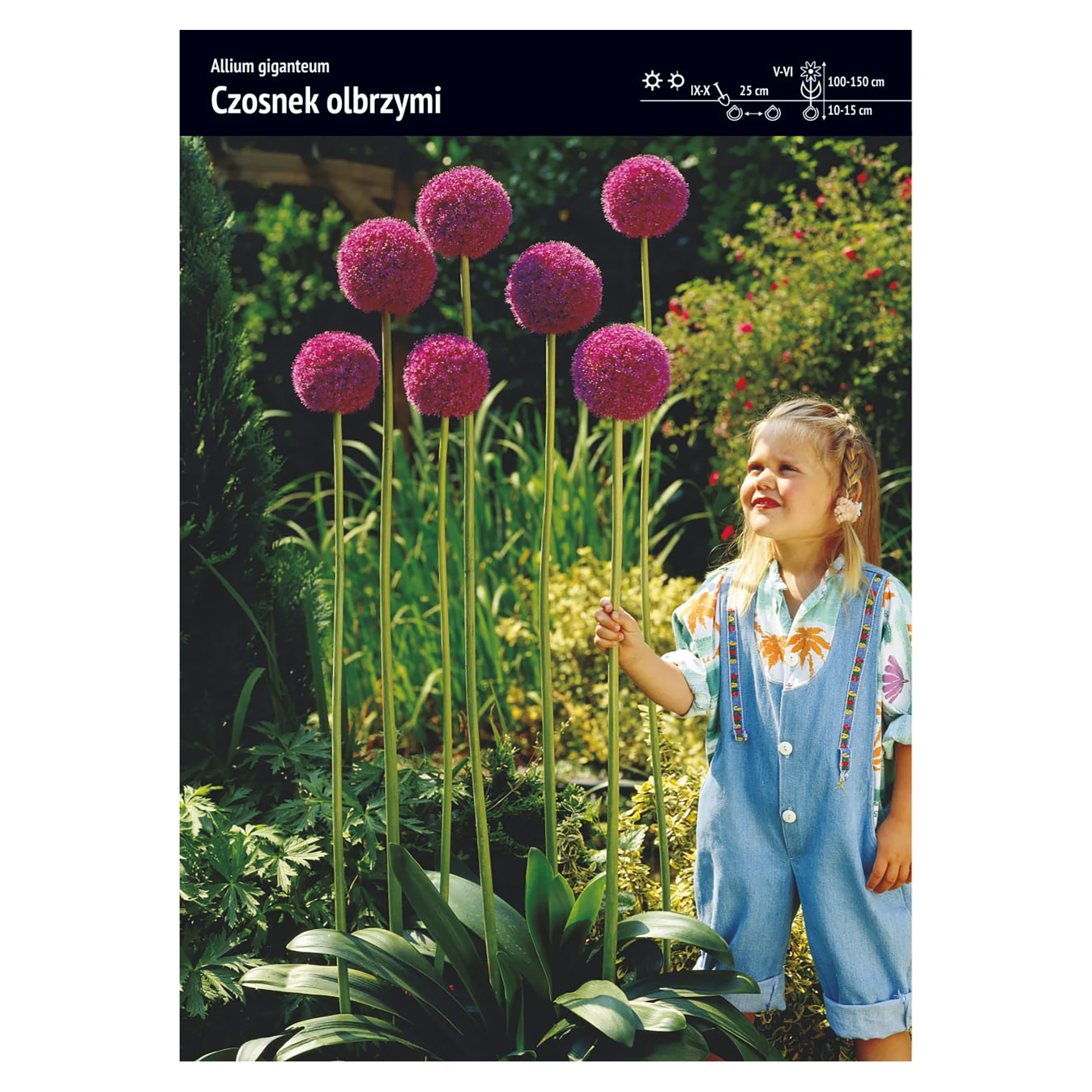Czosnek ozdobny olbrzymi dorasta nawet do 150 cm wysokości i wydaje na świat owalne fioletowe kwiaty o średnicy ok. 12 cm. To prawdziwy olbrzym! Zaczyna kwitnąć od maja. Uzupełniającym dodatkiem są jego masywne, błyszczące i intensywnie zielone liście.