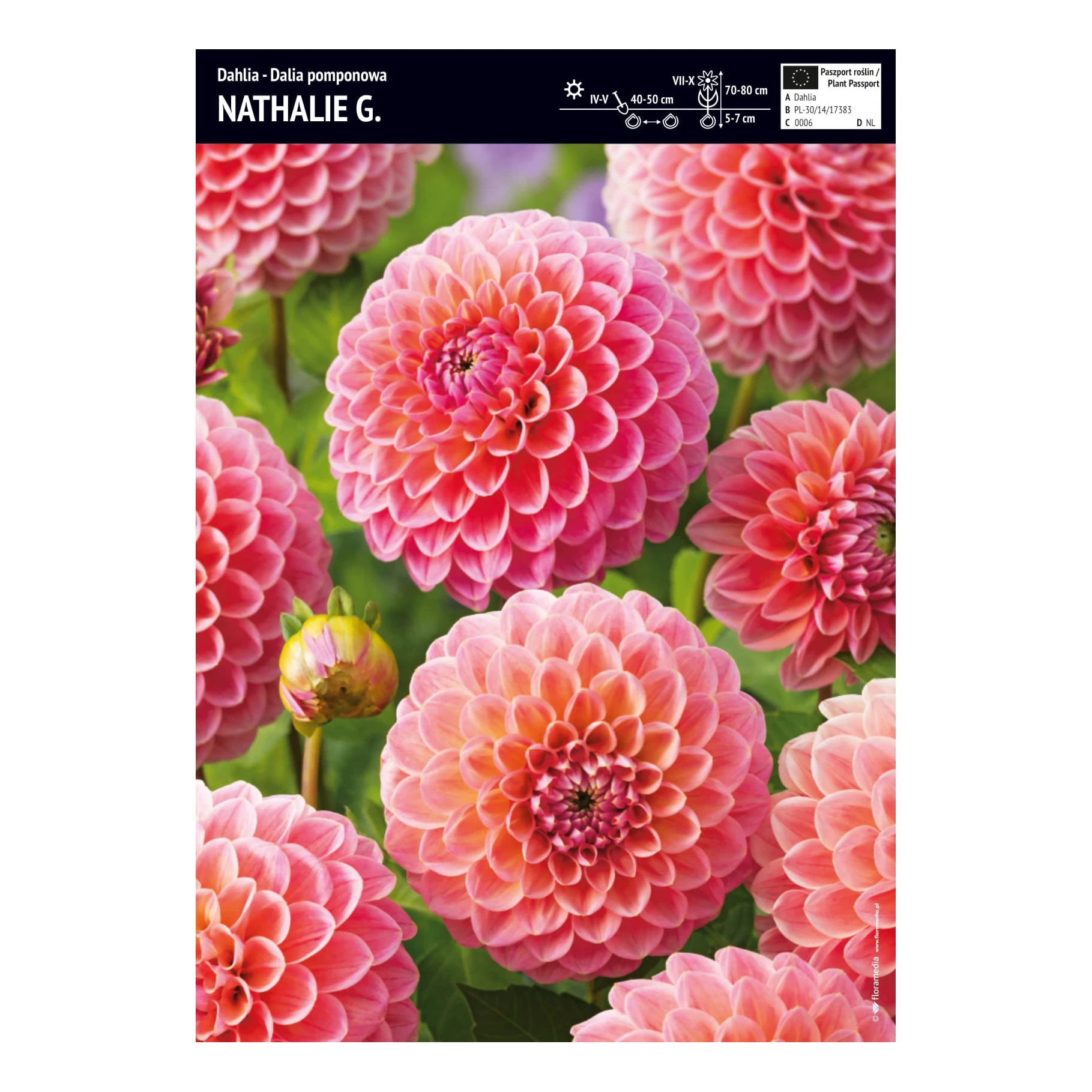 Dalia pomponowa Nathalie G to wyjątkowa odmiana o charakterystycznych, kulistych kwiatach zbudowanych z gęsto ułożonych płatków. Jej pomarańczowo-różowa kolorystyka wprowadza do ogrodu ciepły, energetyczny akcent.
