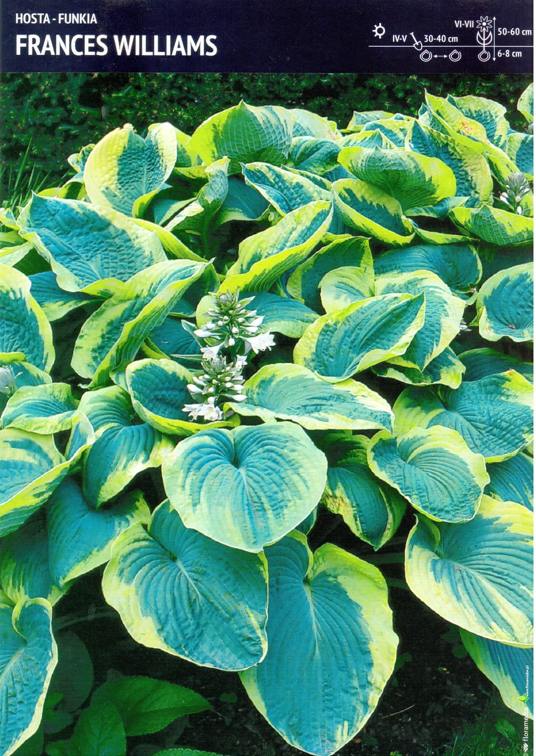 Funkia (zwana też hostą) odmiany "Francess Williams" dorasta do ok. 60 cm wysokości. Roślina składa się z burzy gęsto ułożonych długich, sercowatych liści w kolorze niebiesko-zielony z jasnym żółtym brzegiem. Zakwita czerwcu i lipcu drobnymi dzwonkowatymi kwiatami w kolorze białym, na długich pędach wzniesionych do góry.