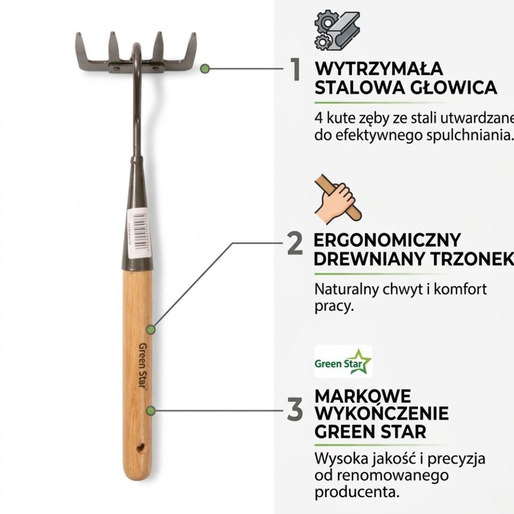 Grabki ręczne Pro Natura z drewnianą rączką Green Star to klasyczne i niezwykle funkcjonalne narzędzie, które doskonale sprawdzi się podczas precyzyjnych prac na rabatach, w szklarniach oraz w donicach balkonowych. Wyposażone w cztery solidne, stalowe zęby, umożliwiają sprawne wyrównywanie niewielkich powierzchni gleby oraz usuwanie drobnych zanieczyszczeń czy suchych liści z trudno dostępnych miejsc. Trzonek wykonany z wysokiej jakości naturalnego drewna zapewnia nie tylko estetyczny wygląd, ale przede wszystkim komfortowy i pewny chwyt, co przekłada się na mniejsze zmęczenie dłoni. Solidne osadzenie głowicy gwarantuje trwałość narzędzia, czyniąc je niezawodnym partnerem w codziennej pielęgnacji ogrodu.