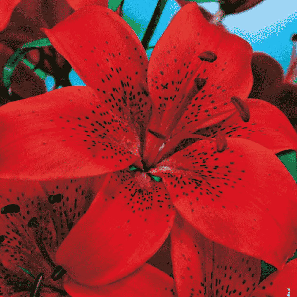 Lilia azjatycka Diabora to wyjątkowo efektowna odmiana o intensywnie czerwonych, karminowych kwiatach, ozdobionych drobnymi czarnymi plamkami u nasady płatków. Taki detal nadaje kwiatom głębi i wyrazistego, eleganckiego charakteru.