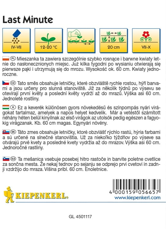 Chcesz atrakcyjnie upiększyć puste przestrzenie kolorowym dywanem kwiatów, ale nie masz czasu na czekanie? Nie ma problemu! Zrobisz to z mieszanką kwiatów "Last Minute"! Szybko rosnące rośliny można wysiewać jeszcze w połowie lipca. Wykiełkują krótko po siewie, by kwitnąć obficie i wytrwale aż do przymrozków.