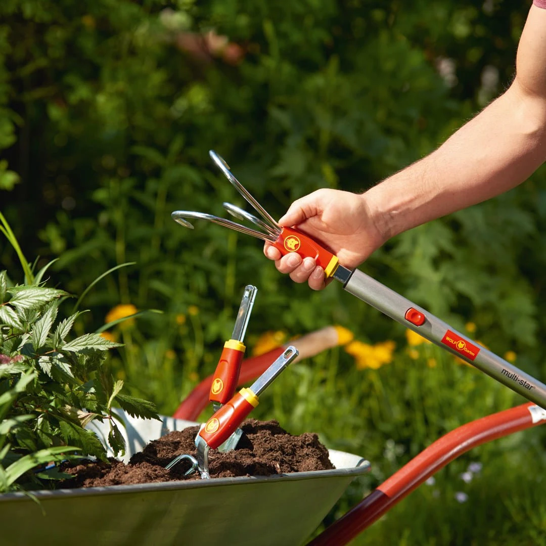 Innowacyjny system multi-star zauroczył już wielu ogrodników. Firma Wolf Garten opracowała 15 uchwytów (trzonków i końcówek) oraz ponad 70 różnych przystawek (narzędzi) do prawie wszystkich prac ogrodniczych. I wszystkie można łączyć ze sobą za pomocą kliknięcia. W praktyce oznacza to, że wystarczy wybrać jeden trzonek i dopasować do niego inne narzędzia, których potrzebujesz.
