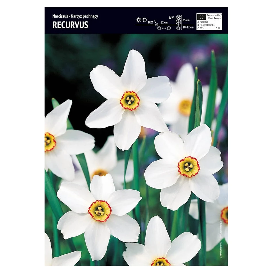 Narcyz "Recurvus" dorasta do ok. 35 cm wysokości. Wydaje na świat duże białe kwiaty. Narcyzy są przede wszystkim zwiastunem nowego sezonu i jednymi z pierwszych zakwitających kwiatów, którymi cieszą nas w kwietniu i maju.
