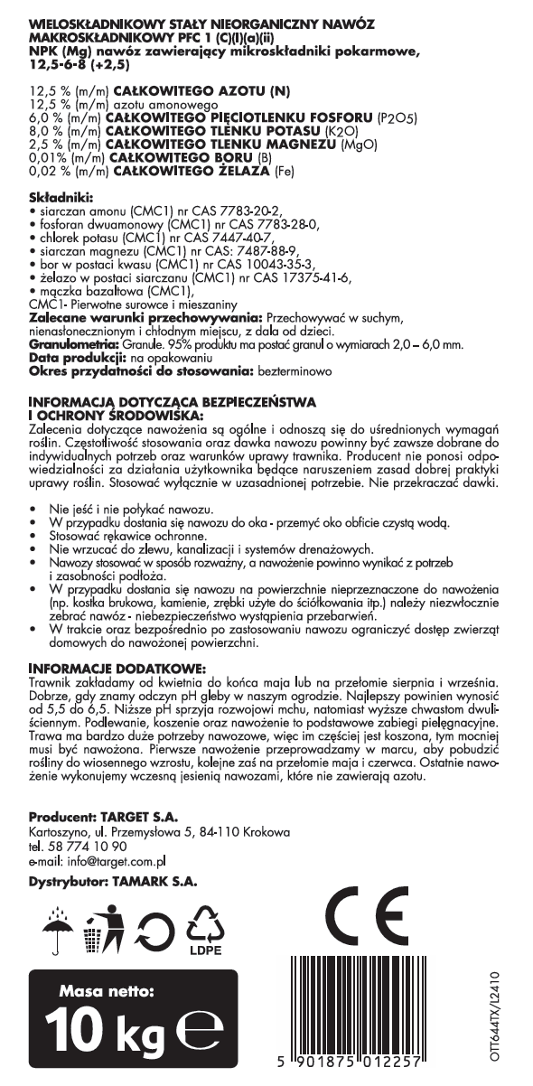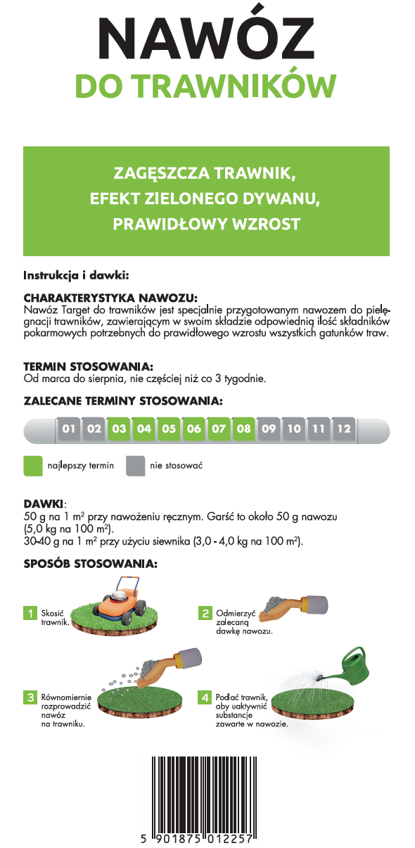 Nawóz do trawnika z mikroskładnikami Target to wieloskładnikowy nawóz mineralny NPK w formie granulatu, stworzony specjalnie z myślą o uzyskaniu efektu zdrowego, gęstego i soczyście zielonego trawnika. Zawiera idealnie zbilansowane proporcje azotu, fosforu, potasu i magnezu oraz zestaw mikroelementów (bor, żelazo, mangan, cynk, miedź), które zapewniają trawie wszystkie niezbędne składniki do intensywnego wzrostu i prawidłowego odżywienia przez cały sezon.