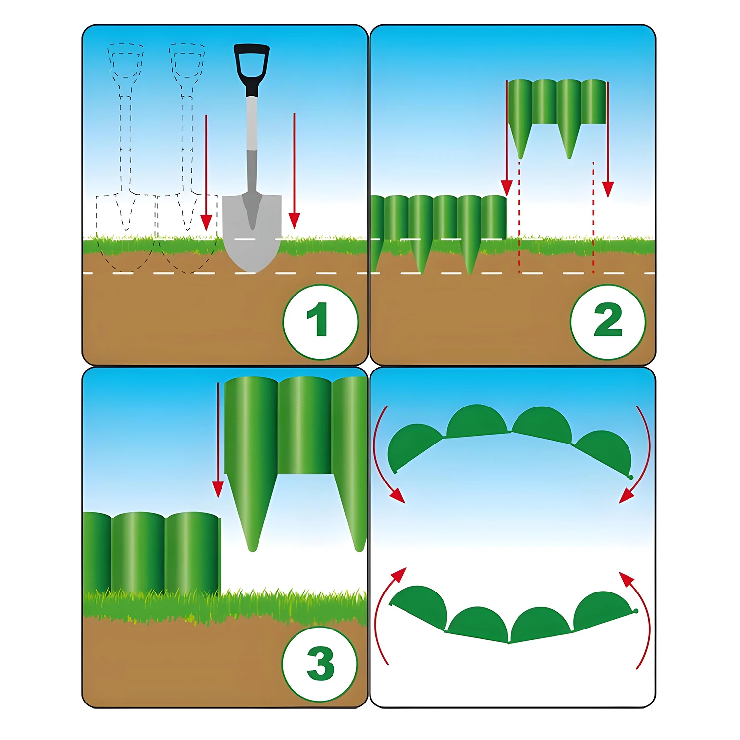 Obrzeże jest proste w montażu. Wystarczy połączyć żądaną liczbę elementów, a następnie wcisnąć w ziemię lub wbić za pomocą gumowego młotka (w zależności od twardości podłoża). Nie wymaga ono stosowania żadnych kotew ani uchwytów.