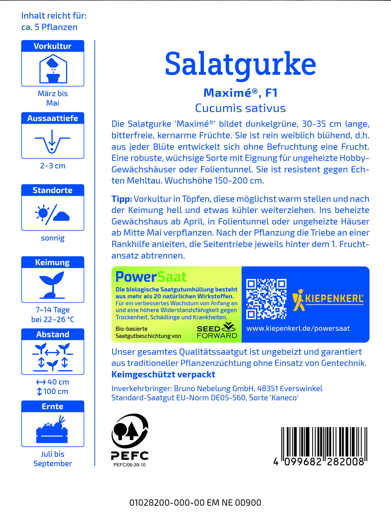 Ogórek sałatkowy "Maxime" F1 (Cucumis sativus) to ciemnozielona odmiana o świeżym, aromatycznym smaku, całkowicie pozbawiona goryczy i praktycznie bezpestkowa. Owoce osiągają długość 30–35 cm i zachowują bardzo dobrą jakość nawet przy intensywnym wzroście.