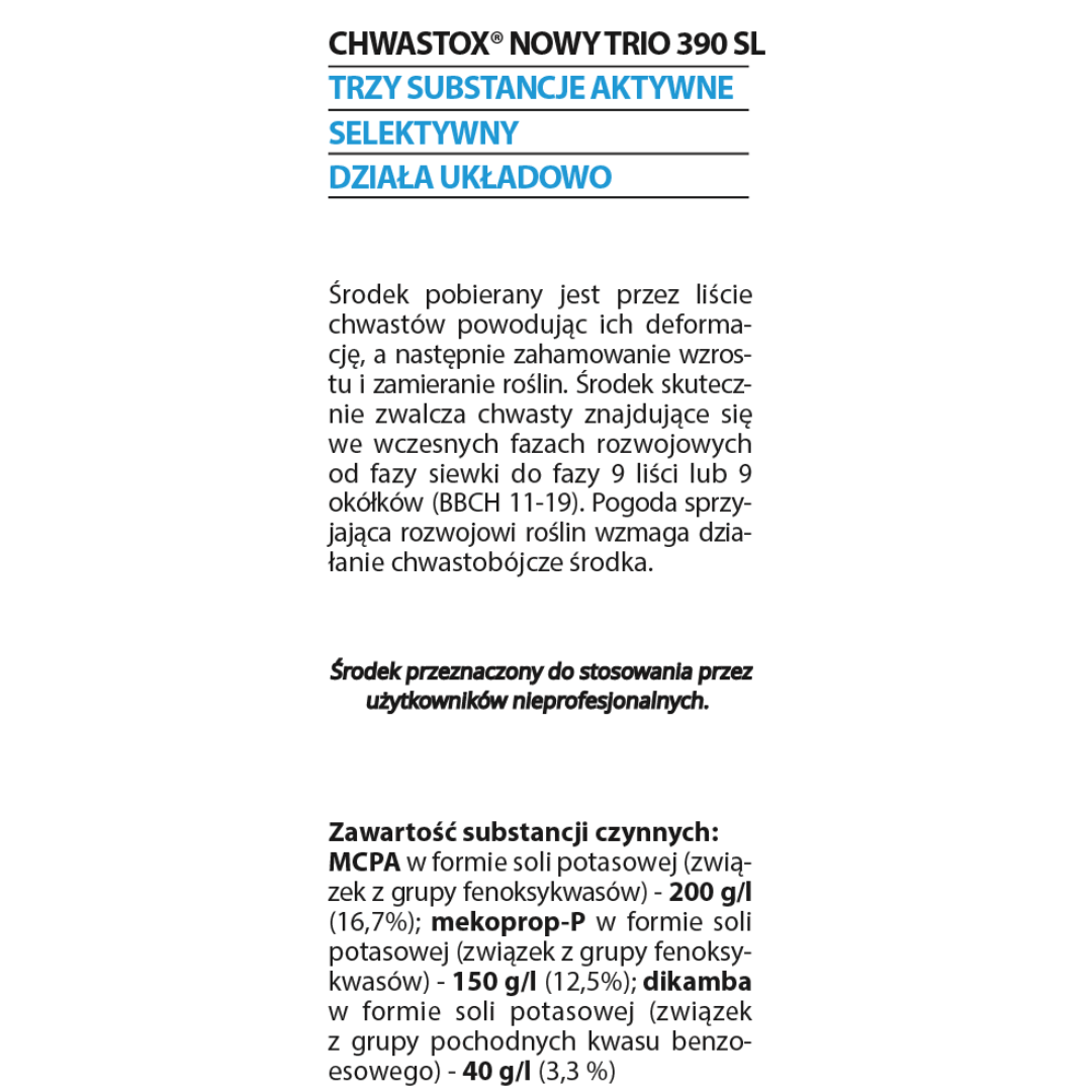 Chwastox Nowy Trio 390 SL to herbicyd przeznaczony do zwalczania chwastów dwuliściennych na trawnikach. Preparat działa kontaktowo i układowo – wnika przez liście chwastów, a następnie przemieszcza się do korzeni, powodując ich zamieranie.