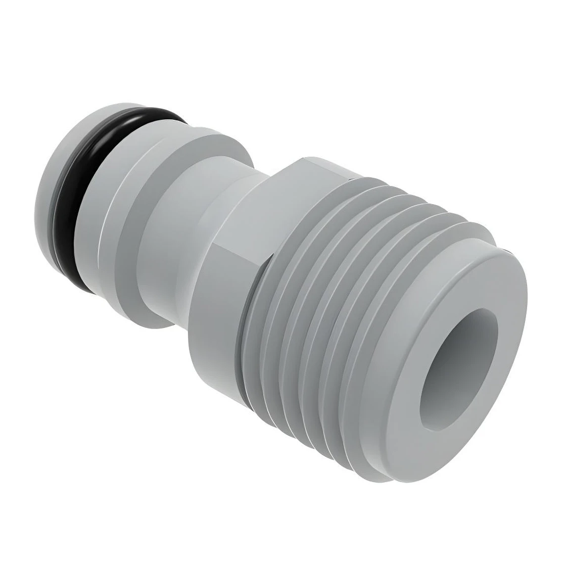 Przyłącze kranowe umożliwiające podłączenie węża ogrodowego za pomocą szybkozłączki. Posiada gwint zewnętrzny pasujący na kran o średnicy 1/2". Przyłącza z gwintem zewnętrznym wykorzystuje się również jako zakończenie linii kroplującej. Wykonana z solidnego tworzywa ABS (wykorzystywane między innymi w druku 3D oraz wykonywaniu elementów karoserii samochodowych). Połączenie za pomocą tego przyłącza nie powoduje utraty ciśnienia wody.
