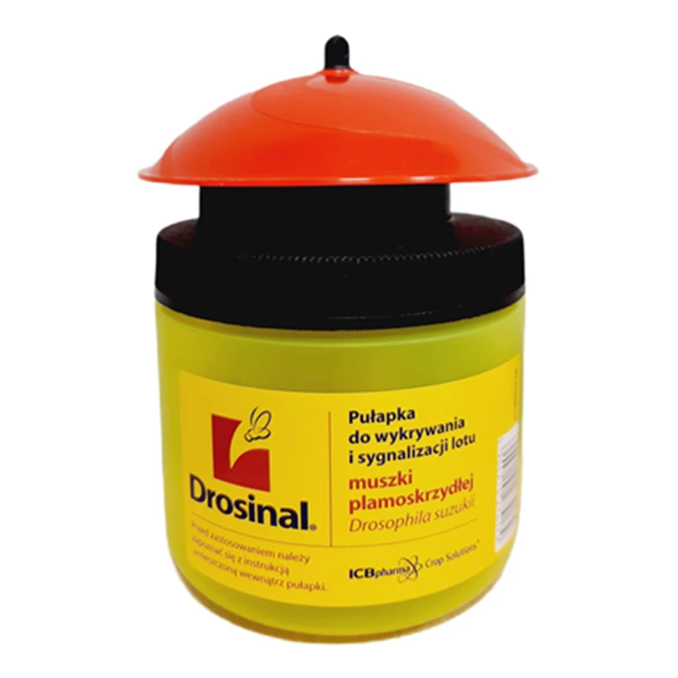 Pułapka Drosinal to profesjonalne narzędzie do walki z muszką plamoskrzydłą (Drosophila suzuki) – jednym z najbardziej uciążliwych szkodników plantacji owoców miękkich. Stosowana zarówno do monitoringu populacji, jak i do masowego odławiania, stanowi kluczowy element w skutecznej ochronie plonów.