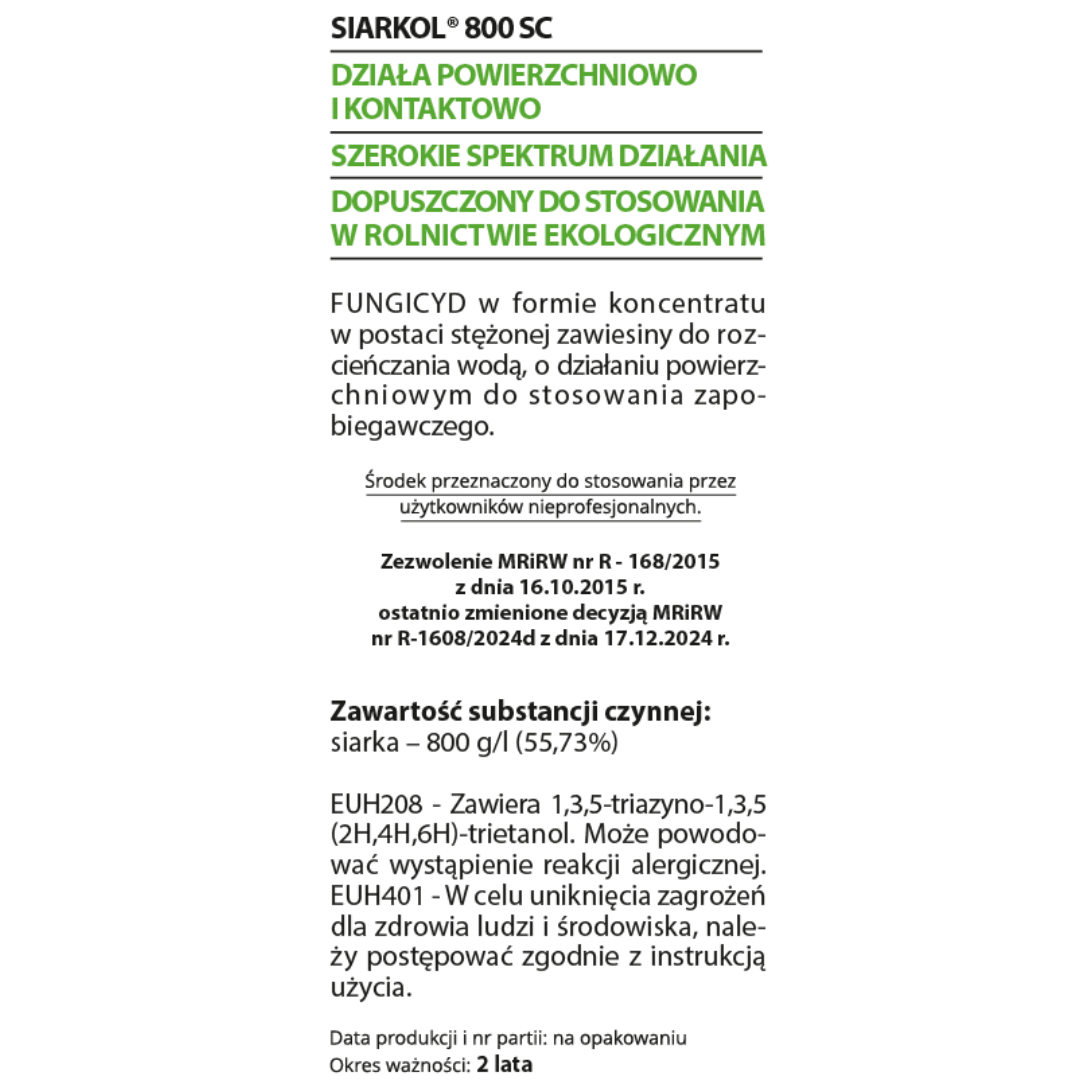 Siarkol 800 SC to skuteczny środek grzybobójczy w formie koncentratu zawiesinowego, przeznaczony do ochrony szerokiej gamy roślin. Preparat działa powierzchniowo, tworząc warstwę ochronną, która skutecznie hamuje rozwój mączniaków i innych chorób grzybowych.