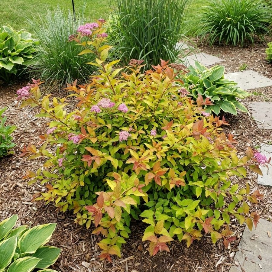 Tawuła japońska Goldflame – 20–30 cm – zmienne kolory liści i różowe kwiaty – Botana