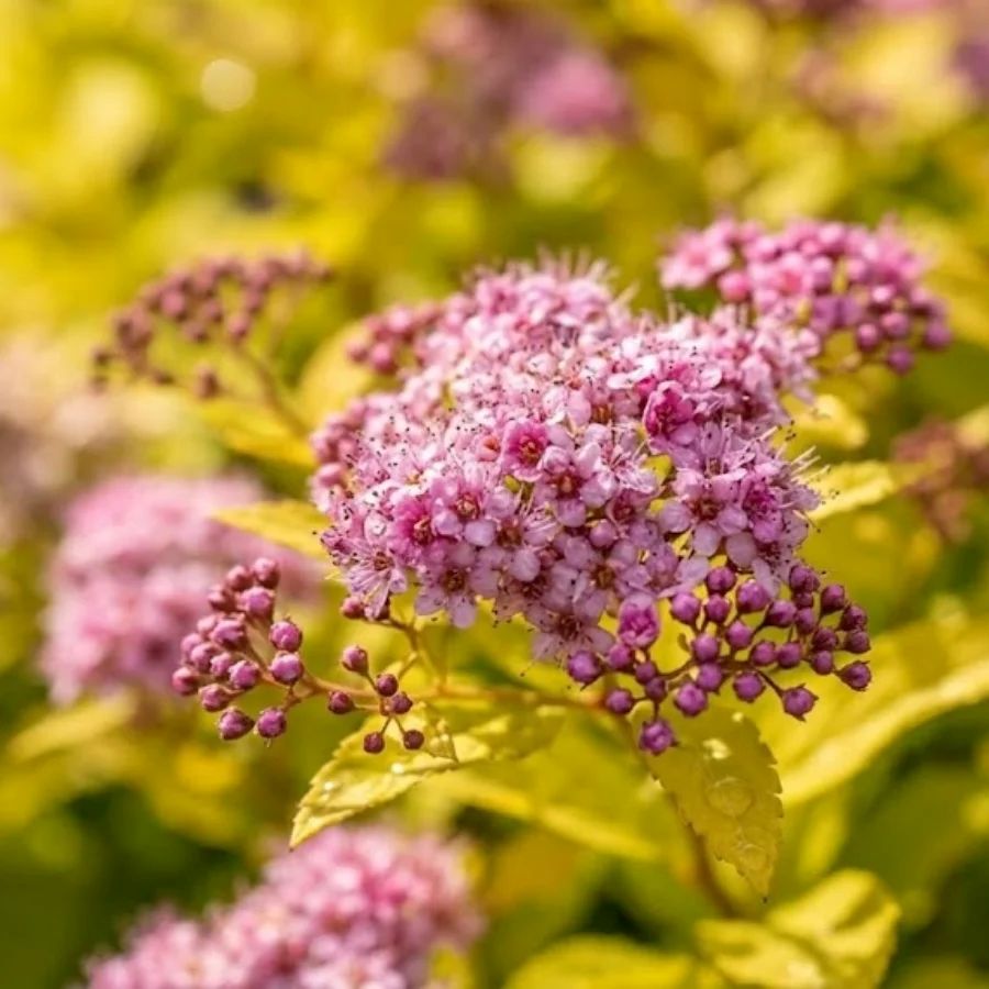 Tawuła japońska Goldmound – 10–20 cm – złote liście i różowe kwiaty – Botana