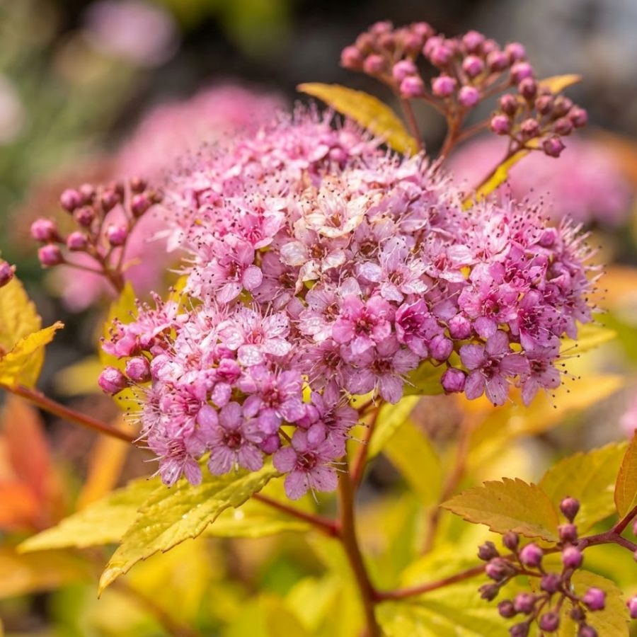 Tawuła japońska Magic Carpet – 15–20 cm – niski krzew o kolorowych liściach i różowych kwiatach – Botana