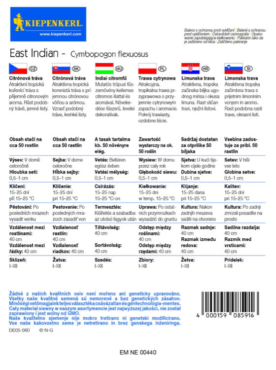 "East Indian" wyrasta z nasion i różni się od prawdziwej trawy cytrynowej, którą można rozmnażać tylko przez podział. Ponadto jest bardziej wytrzymała pomimo delikatnych liści. Zioło uwielbia ciepło i może być uprawiane w pomieszczeniach lub w oranżerii przez cały rok. Jeśli chcesz, możesz również uprawiać odmianę "East Indian" na wolnym powietrzu latem aż do mrozów.