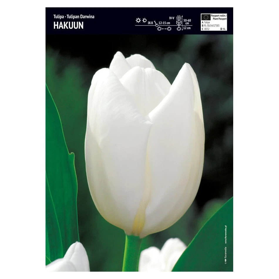Tulipan "Hakuun" dorasta jedynie do ok. 60 cm wysokości i wydaje na świat białe kwiaty. Odmiana kwitnie w kwietniu.