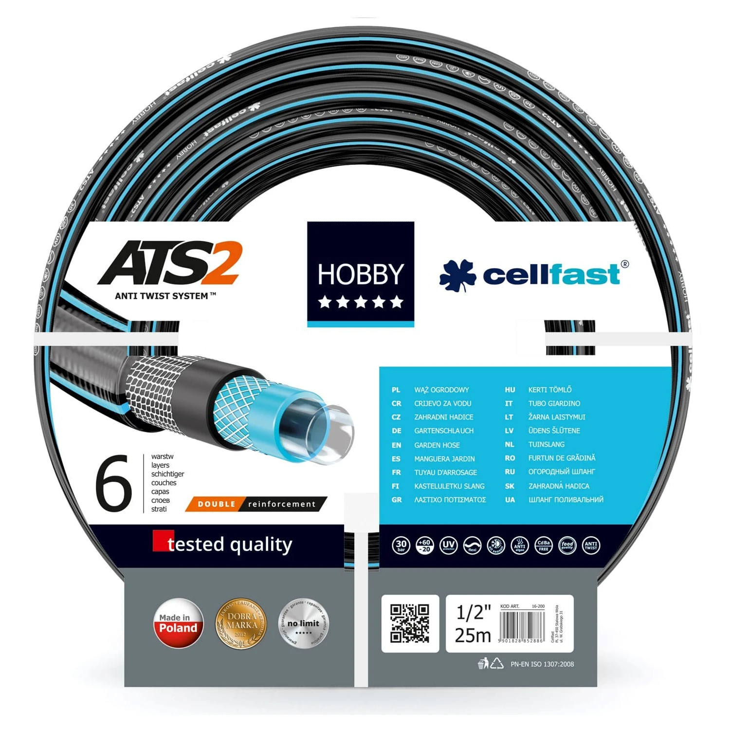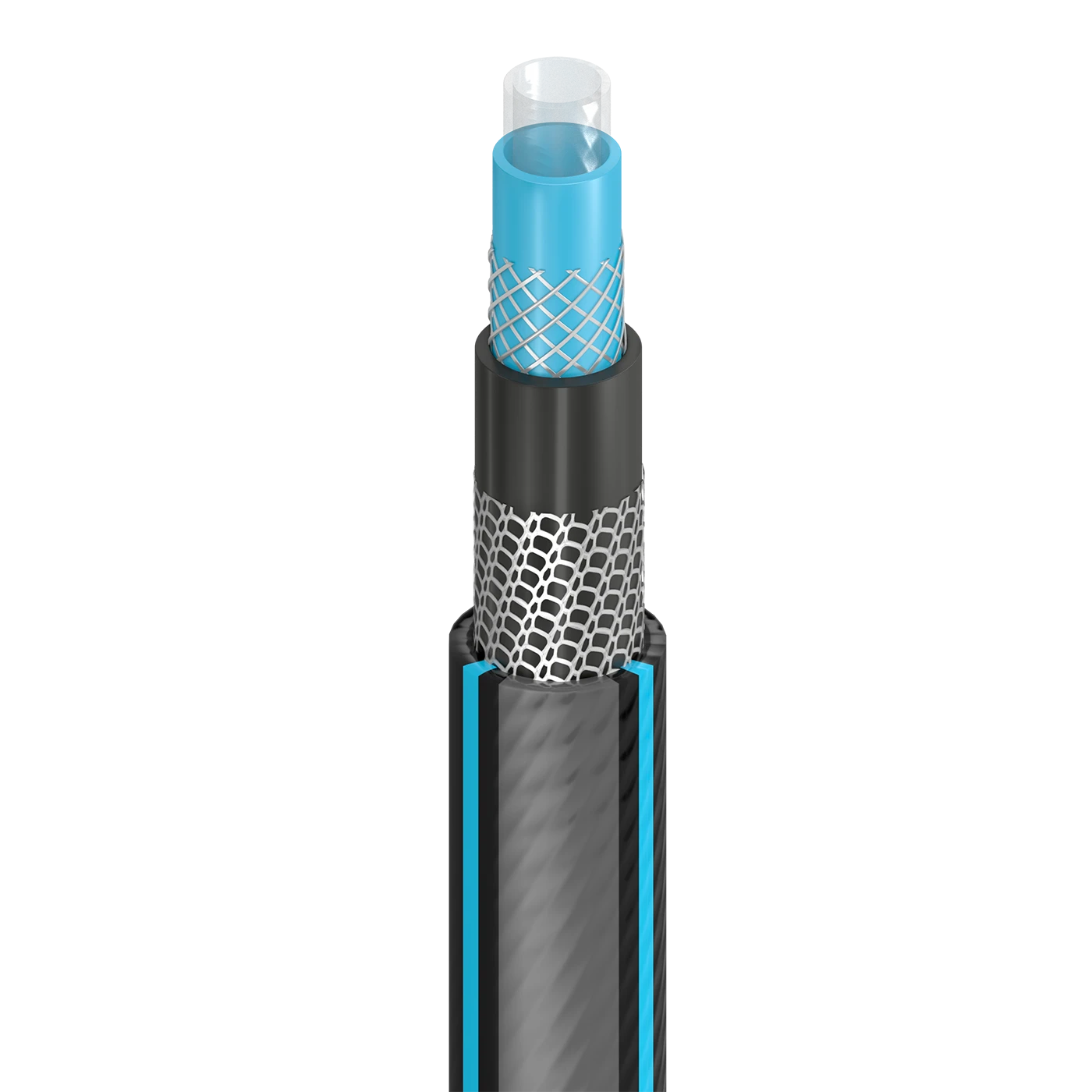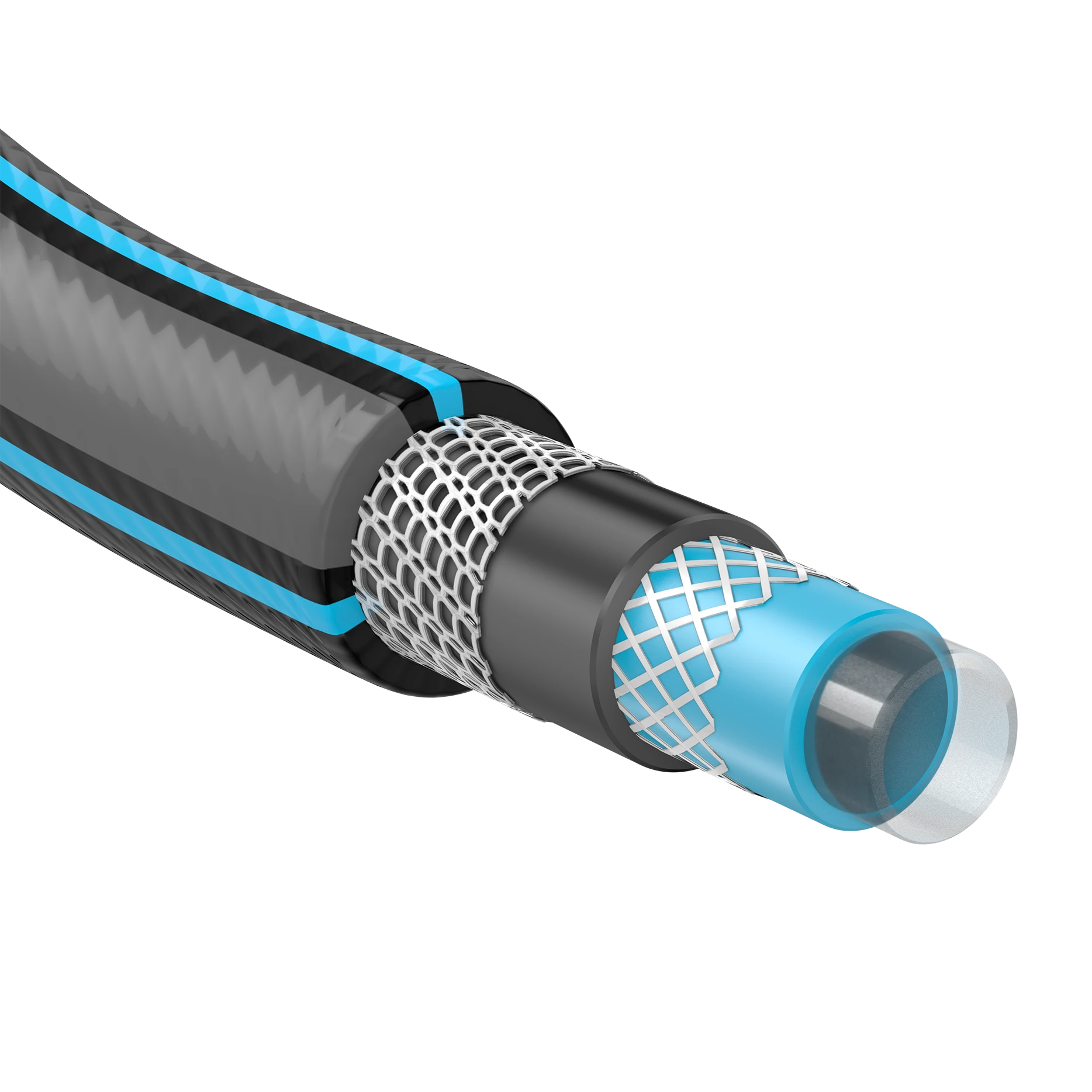 Wąż ogrodowy w kolorze czarno-niebieskim długości 20 m. Wykonany z aż 6 warstw (w tym 2 warstwy oplotu krzyżowego). Dzięki takiej konstrukcji jest niemal nierozrywalny, a także odporny na wszelkie załamania oraz splątania. Wąż jest odporny na promieniowanie UV (dzięki czemu nie kruszeje) oraz osiadanie glonów wewnątrz.