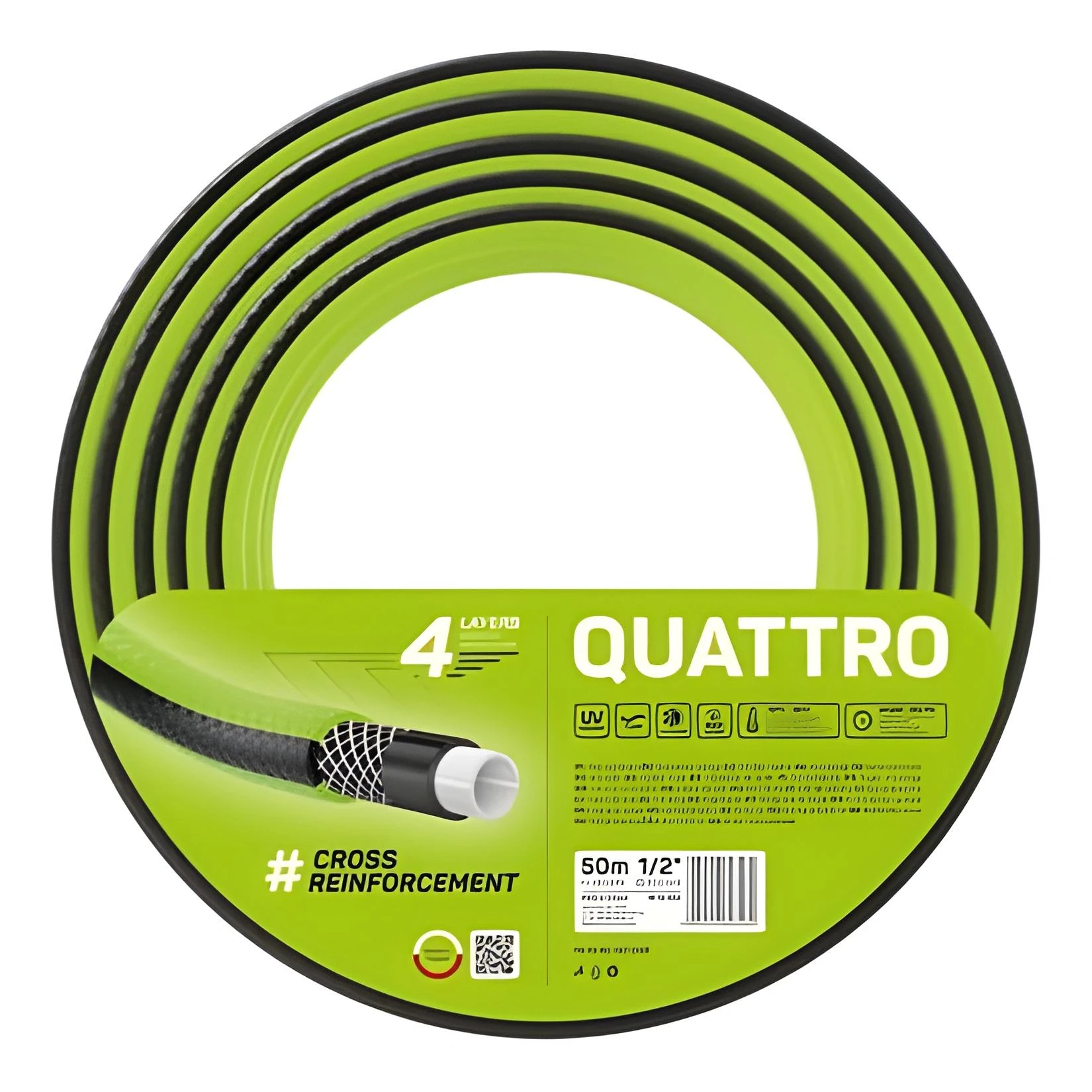 Wąż ogrodowy Cellfast Quattro o długości 50 m i średnicy 1/2" w zielono-czarnym kolorze. Wykonany jest z czterech warstw. Pomiędzy dwoma warstwami wewnętrznymi oraz jedną zewnętrzną umieszczony został oplot krzyżowy z poliestru. Dzięki takiej konstrukcji wąż jest trwały, bardzo elastyczny i odporny na wszelkie załamania oraz skręcenia.
